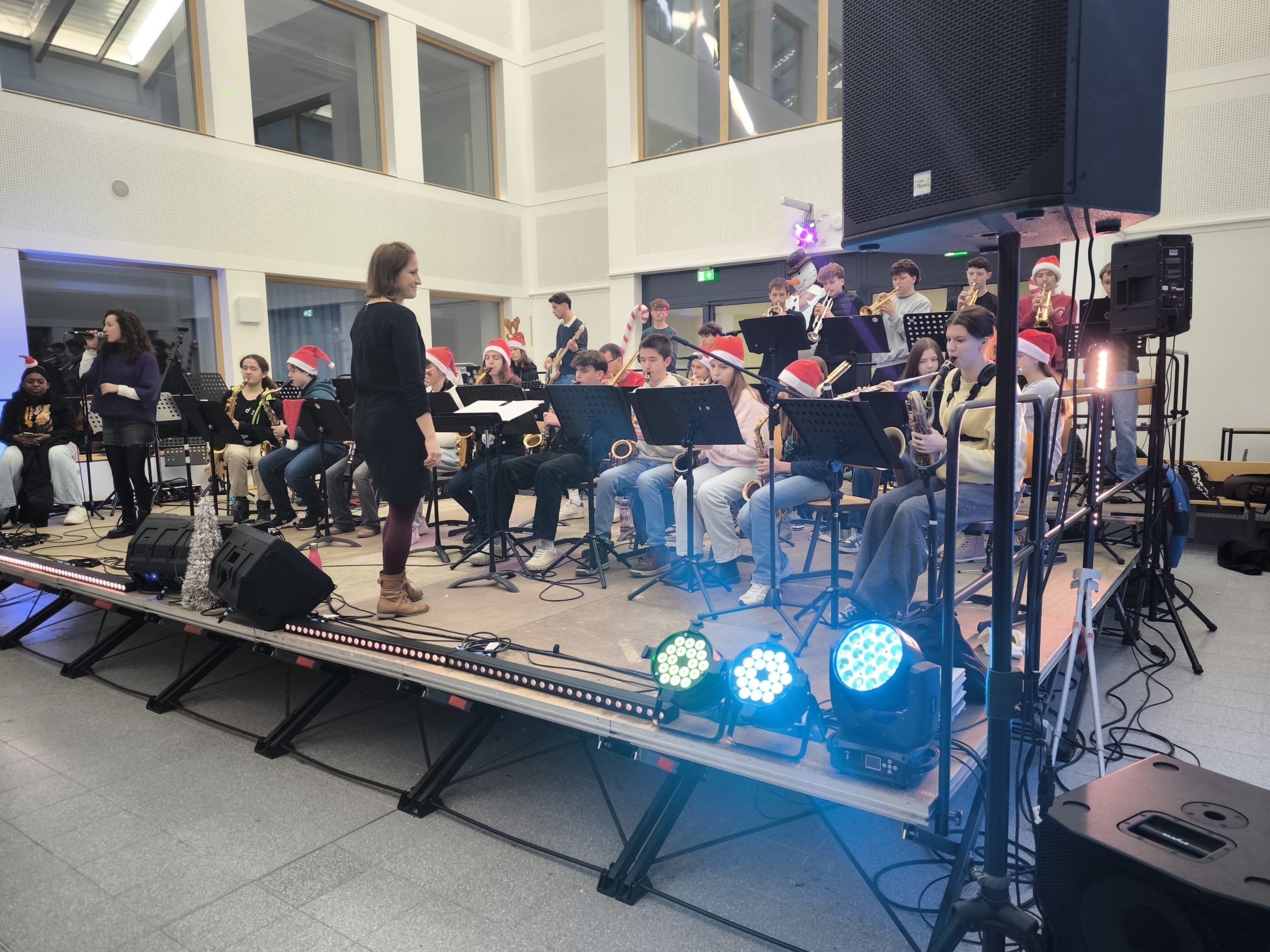 Am 19. Dezember lud unser traditioneller Weihnachtsbasar einmal wieder zum geselligen Beisammensein in festlicher Atmosphäre ein. Schülerinnen und Schüler, Lehrerinnen und Lehrer sowie zahlreiche Eltern waren der Einladung gefolgt und erfreuten sich an liebevoll dekorierten Ständen, der bunten Vielfalt weihnachtlicher Bastelarbeiten , kulinarischen Köstlichkeiten und natürlich der mitreißenden Musik unserer grandiosen Bigband.